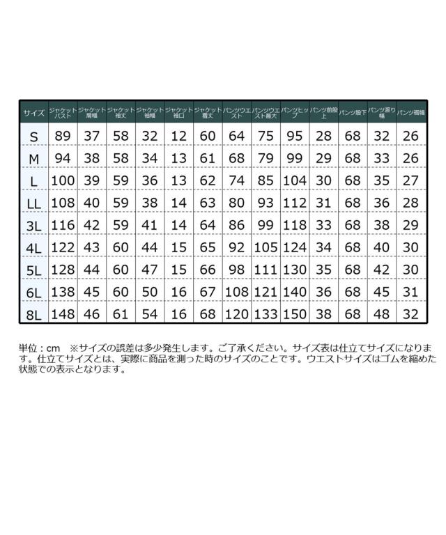 品質=[表地]ポリエステル100%(ストレッチ織物) [裏地]有(ジャケット:背抜き パンツ:総裏 ストレッチ裏地使用) ジャケット:肩パッド無 前ホック開 袖口ベンツ パンツ:前ホック内ボタン付ファスナー開 ウエスト後ゴム入 ポケット両脇・後飾り ※この商品は2点同サイズのみで販売します。 ※ジャケットはLLサイズから胸ダーツ有 原産国:中国製(企画デザインは日本) 備考:洗濯機OK ネット使用 単位:cm ※サイズの誤差は多少発生します。ご了承ください。サイズ表は仕立てサイズになります。仕立てサイズとは、実際に商品を測った時のサイズのことです。ウエストサイズはゴムを縮めた状態での表示となります。