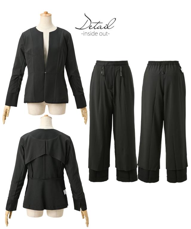 【レディーススーツ】ペプラムジャケットパンツスーツ(ノーカラージャケット+ワイドパンツ)(ストレッチウール調シリーズ)