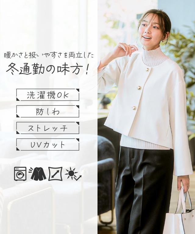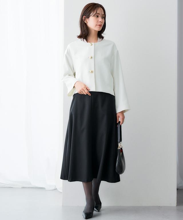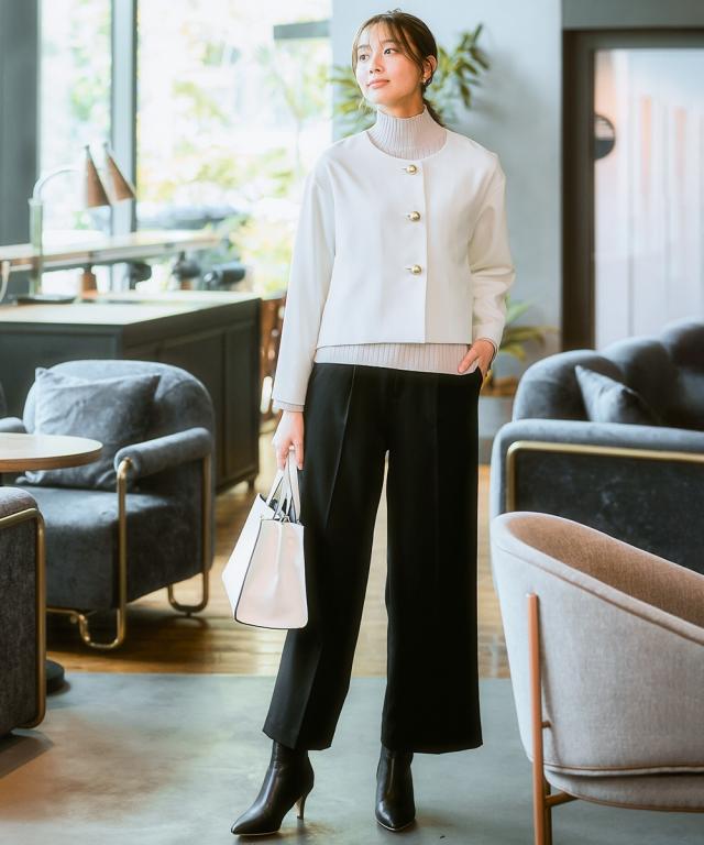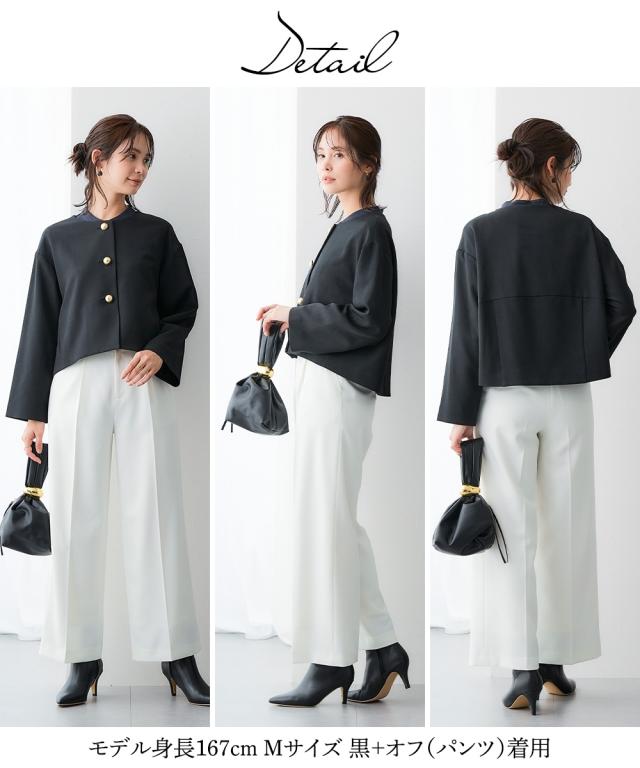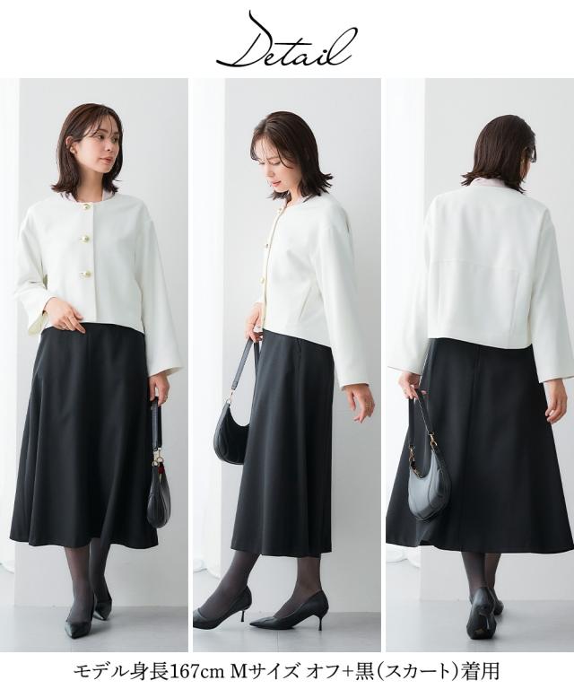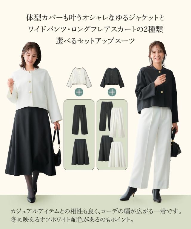 【レディーススーツ】 OTOさんコラボ ボトムが選べるセットアップスーツ(ノーカラージャケット+ワイドパンツまたはロング丈フレアスカート)(ストレッチウール調シリーズ)