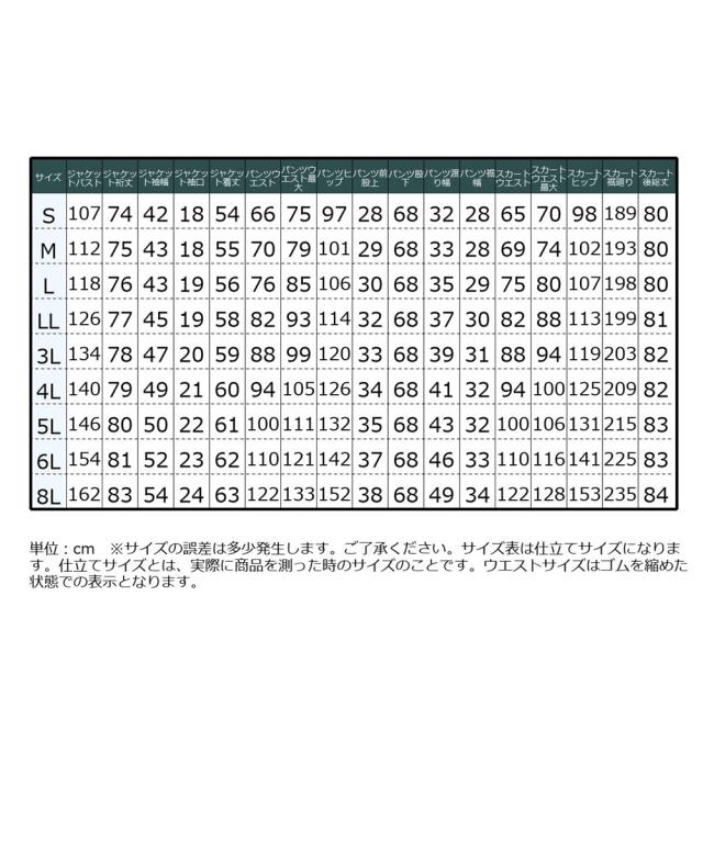 品質=[表地]ポリエステル100%(ストレッチ織物) [裏地]有(総裏 ストレッチ裏地使用) ジャケット:肩パッド無 前ボタン開 パンツ:前ファスナー内ボタン付ホック開 ウエスト後ゴム入 ポケット両脇・後飾り スカート:後ファスナー開 ウエスト後脇ゴム入 ポケット両脇 ※この商品は2点同サイズのみで販売します。 ※ジャケットはLLサイズから胸ダーツあり。 原産国:中国製(企画デザインは日本) 備考:洗濯機OK ネット使用 単位:cm ※サイズの誤差は多少発生します。ご了承ください。サイズ表は仕立てサイズになります。仕立てサイズとは、実際に商品を測った時のサイズのことです。ウエストサイズはゴムを縮めた状態での表示となります。
