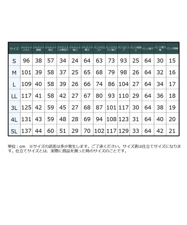 品質=[表地]ポリエステル100% [裏地]有(ジャケット:総裏)パンツ無 ジャケット:肩パッド無 前ボタン開 ポケット前2・左胸・左内 袖口スリット パンツ:前ファスナー内ホック開 ウエスト後ゴム入 ポケット両脇 ※この商品は2点同サイズのみで販売します。 原産国:中国製 備考:洗濯機OK ネット使用 単位:cm ※サイズの誤差は多少発生します。ご了承ください。サイズ表は仕立てサイズになります。仕立てサイズとは、実際に商品を測った時のサイズのことです。