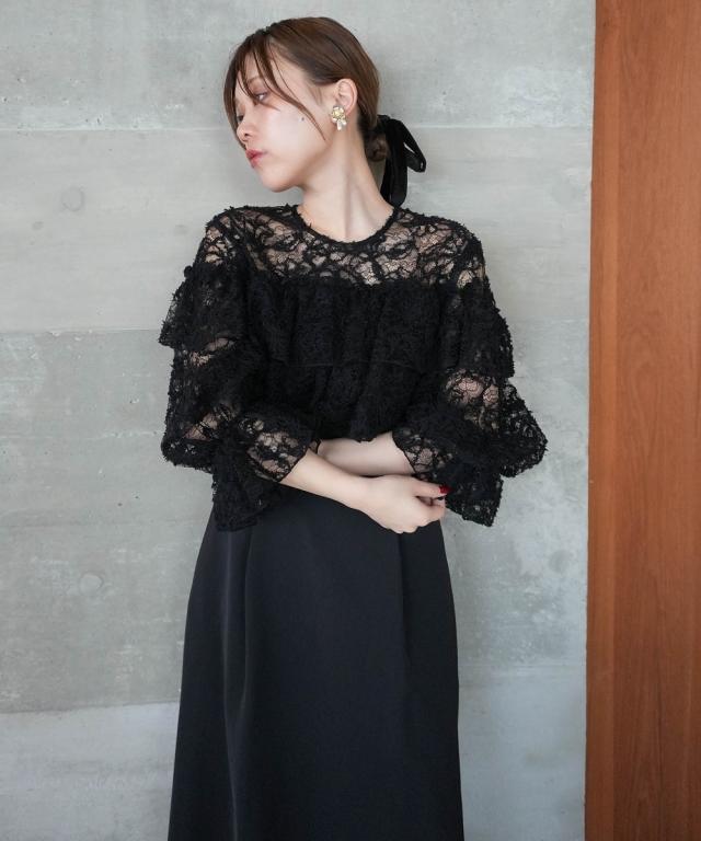 袖口にもレースフリルをあしらい、フェミニンな雰囲気をプラス