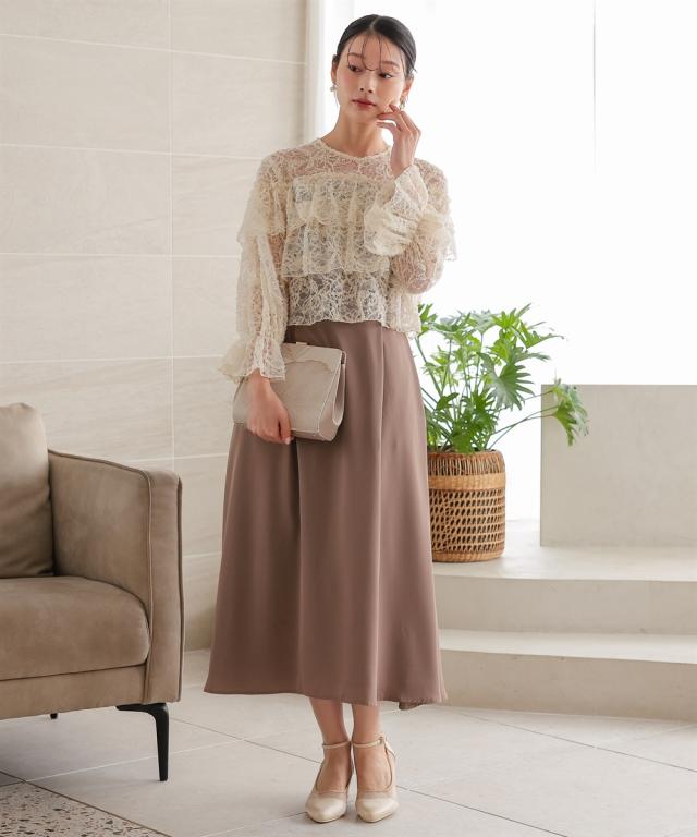 シンプルな無地スカートが全体を引き締め、大人の上品さを演出