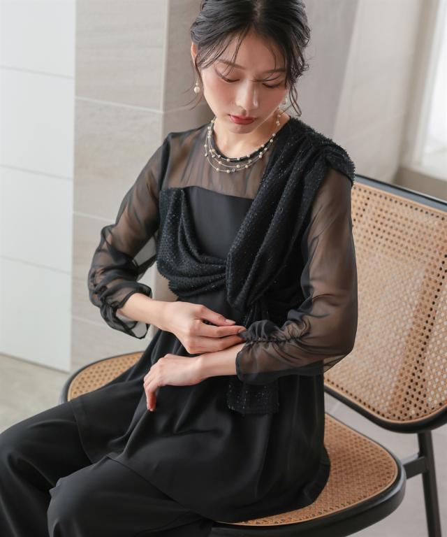 シアー×ツイード風素材の異素材コンビ,華やか見えオールインワン