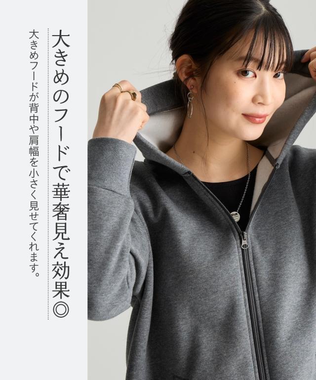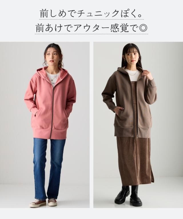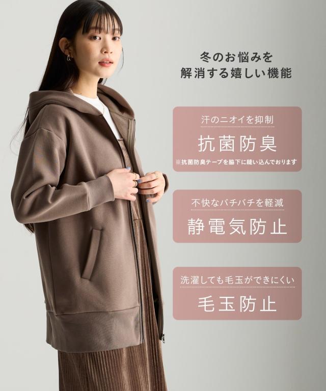 冬のお悩みを解決!ふわっと軽くて、しっかり暖かい。冬の心強い味方です。 ■デザイン シルエットは人気のオーバーサイズ。しっかり体型カバーしつつも、ふくらみすぎない絶妙なバランスで、すっきり見えます。1枚、羽織るだけで気になる腰回りをしっかりカバーしてくれます。前を閉じればチュニックとしても使えて便利。高めの襟で首回りも暖か。便利なポケット付き。 ■素材 肌にやさしい綿100%裏起毛で、チクチク知らずのふんわり感。冬でも意外と気になる汗!抗菌防臭加工付きで、暖房の効いた屋内でもニオイが気になりにくい。冬に多発する静電気も起きにくい!毛玉もできにくく、できても自然と取れて目立たないのが綿素材のいいところ。気軽に洗濯できるのでお手入れ簡単で便利。袖と裾は型崩れしにくいリブ仕上げで伸縮性もあり、毎日着たくなる心地よさです。
