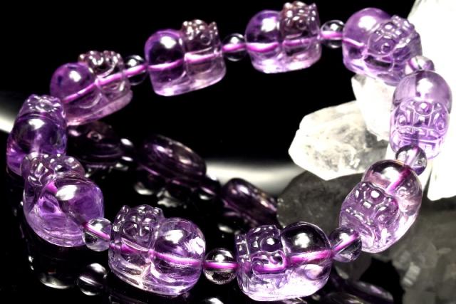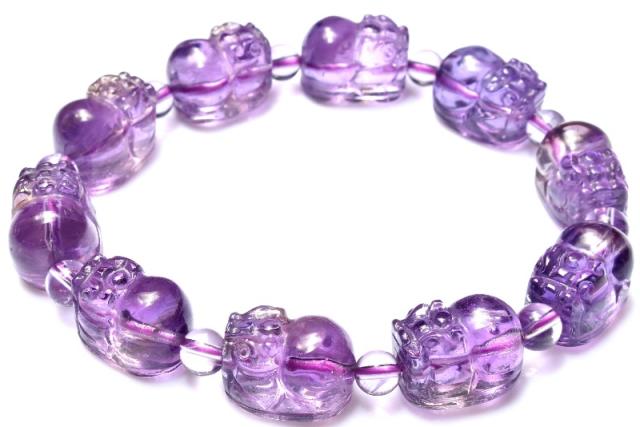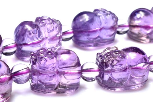 | 特徴・意味 | バイカラーが美しい希少なアメトリンです。透明感があり美しいです。 貔貅の彫刻が繊細に施されたブレスレットで、バラしてハンドメイドパーツにするのもおすすめのアイテムです。 ※貔貅とは中国の伝説上の生き物で、頭は龍、体は馬で、獅子に近い見た目をしています。 古くは邪悪を避ける動物と言われており、別名「避邪」とも呼ばれていました。 現代では「金を食べるが排泄をしない」という伝説から、招財・蓄財などの金運を司る動物とされています。 アメトリンとは、和名を紫黄水晶(しおうすいしょう)といいます。その名のとおり、アメジストとシトリンが混ざった天然石です。 天然もののアメトリンは、産出が少なく唯一、ボリビアのアナイ鉱山のアメトリンのみが、世界でひとつだけの本物とも言われています。もともとシトリン自体が、アメジストが天然の熱により色彩変化したものであり、シトリンも最初の段階では皆、アメジストだったのです。 アメトリンとは、アメジストがシトリンに変化していく段階の途上にある石なのです。アメジストとシトリンそれぞれの石言葉を有し効果もふたつの天然石のものが得られます。また、アメトリン独自の効果も重なり二度ならず三度も美味しい石と言えます。 しかしその歴史は意外にも浅く、1970年代から流通し始め、1990年頃に正式に確認されるという極めて新しい石だったのです。 1970年に発見されたとは言え1990年代に至るまでは、合成された石との認識があった為、アメトリンは色の区切りの良いところでカットされて、アメジストとシトリン別々の石として流通されていたのだとか。過去も現在もボリビアのジャングルの鬱蒼とした場所にあるアナイ鉱山でしか、産出されないので希少な石です。 |