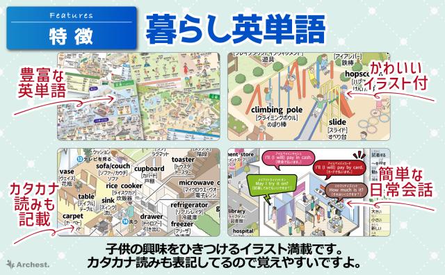 日常のシーンを切り取ったイラストで単語の意味が分かりやすく表現されています。カラフルで楽しいデザインが学習意欲を高め、身近な生活とリンクすることでより覚えやすく、定着率がアップします。