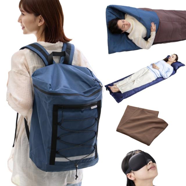 避難 防災用品 非常時 持ち出し袋 寝袋 マルチエアーマット 難燃毛布 アイマスク モッテテプラス 防災リュック宿泊5点セット MOTTETE PLUS ガマカ工業 防災グッズ