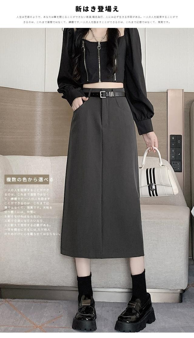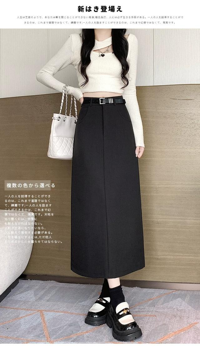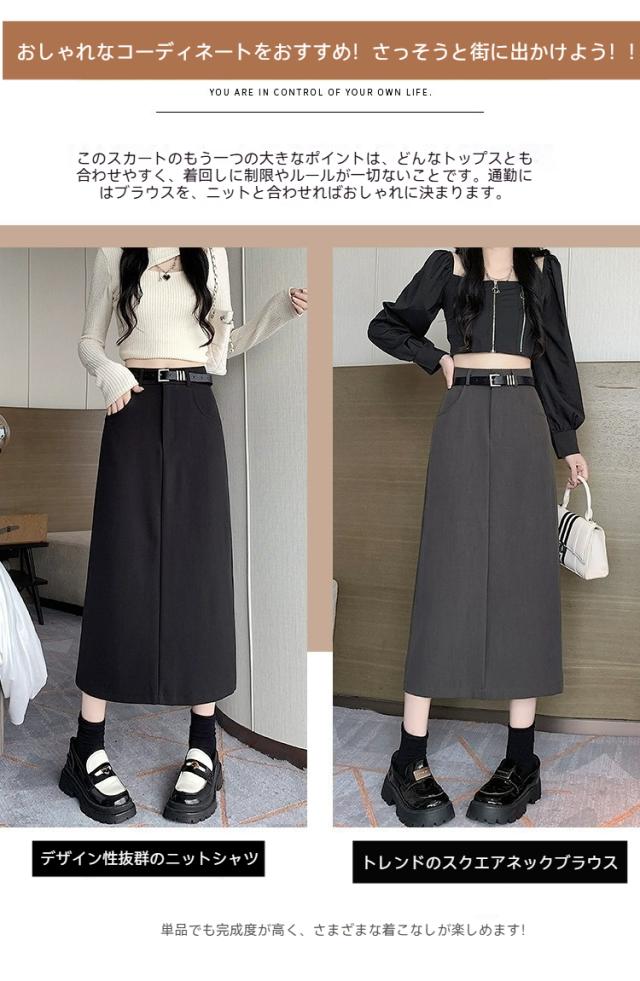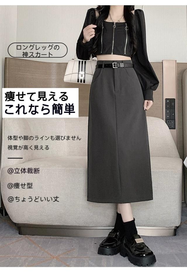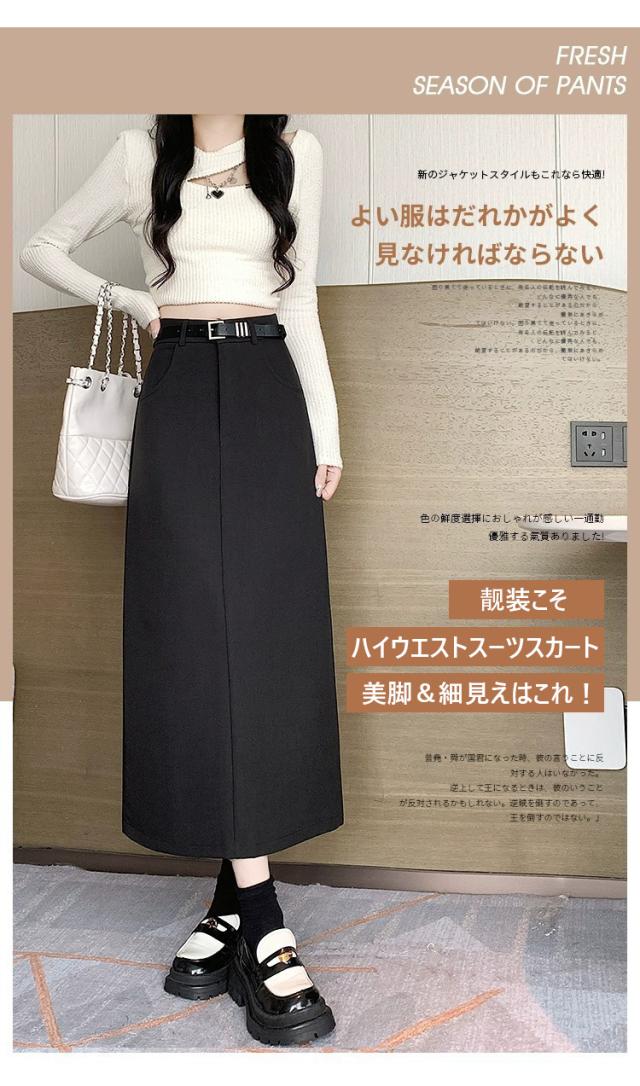 スーツスカート、ロングスカート、ハイウエスト、美脚、細見え、オフィスカジュアル、通勤服、レディースファッション、春秋コーデ、黒スカート、灰色スカート、きれいめ、タイトスカート、韓国風、上品、おしゃれ、大人可愛い