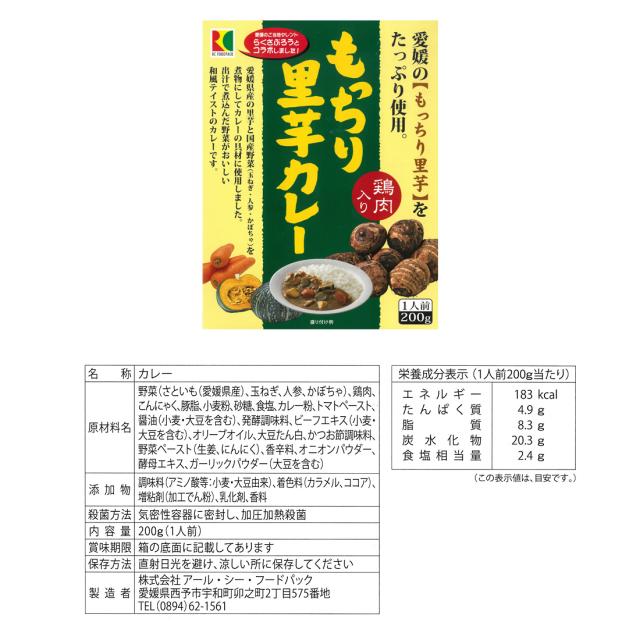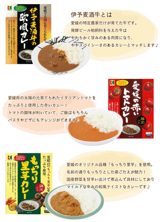 ■商品名:RC伊予麦酒牛の欧風カレー、RC愛媛の赤いトマトカレー、RCもっちり里芋カレー