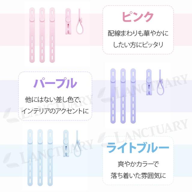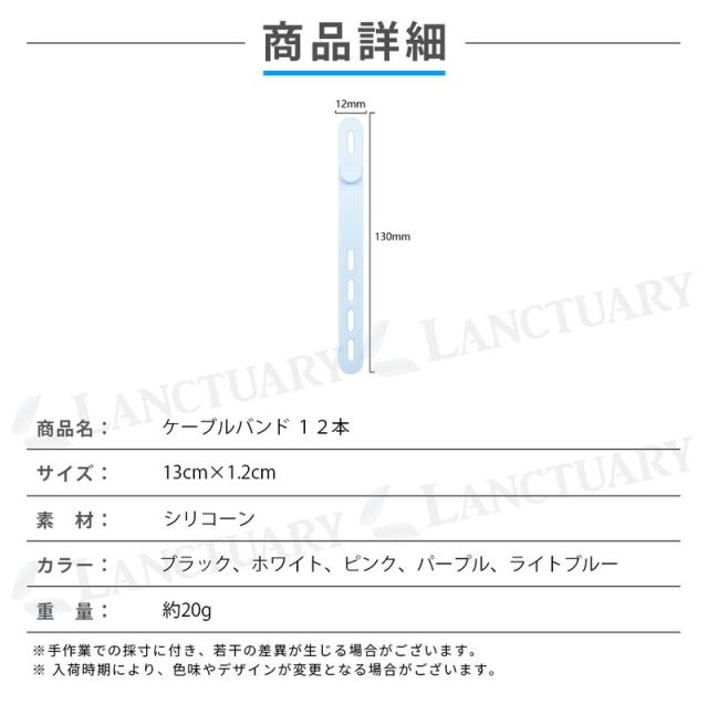 | 主な仕様 | 商品名:ケーブルバンド12本 サイズ:長さ13cm×幅1.3cm カラー:ブラック ホワイト ピンク パープル ライトブルー 素材:シリコーン 重さ:約20g |