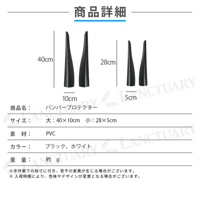 | 主な仕様 | 商品名:バンパープロテクター 素材:PVC サイズ:大 40cm×10cm 小 28cm×5cm カラー:ブラック ホワイト 重量:約 g |