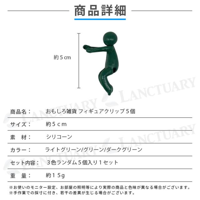 | 主な仕様 | 商品名:フィギュアクリップ5個 カラー:ライトグリーン/グリーン/ダークグリーン 材質:シリコーン サイズ(約):5cm 重さ(約):15g |