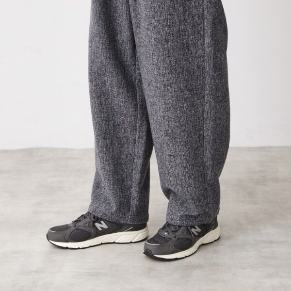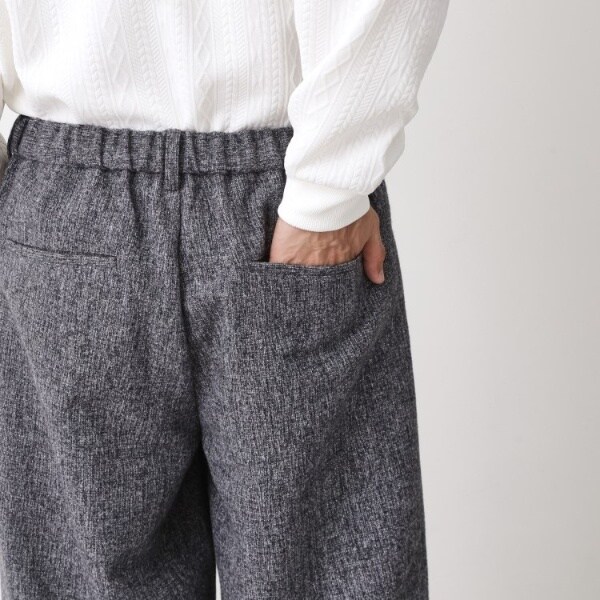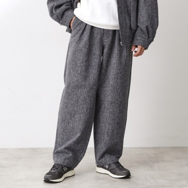 ミックス調ウール見え素材を使用した、オーバーサイズのイージーパンツ。