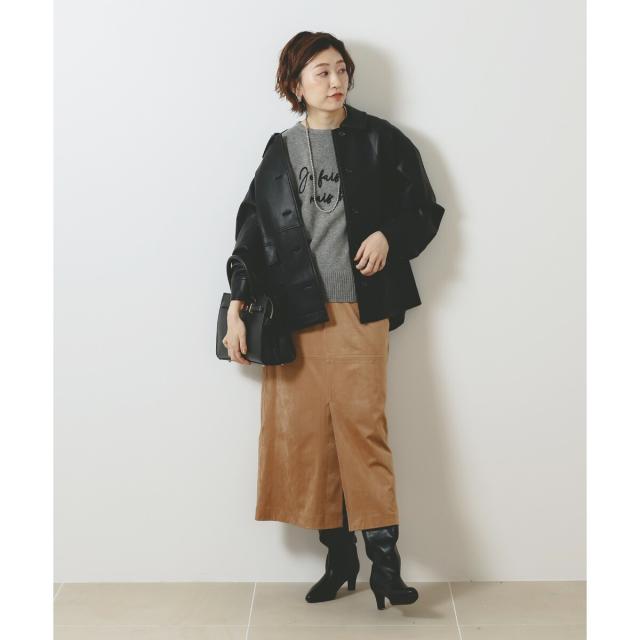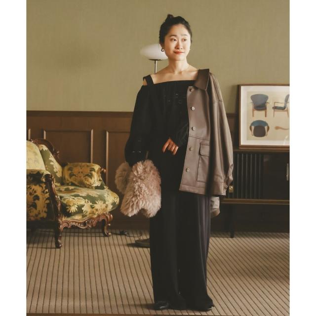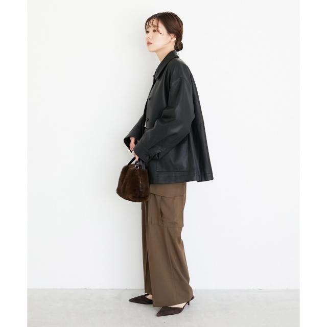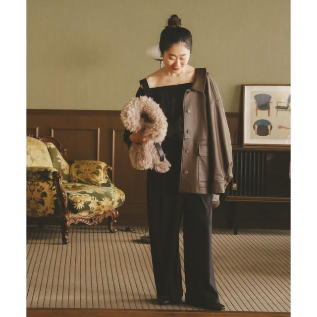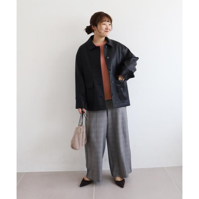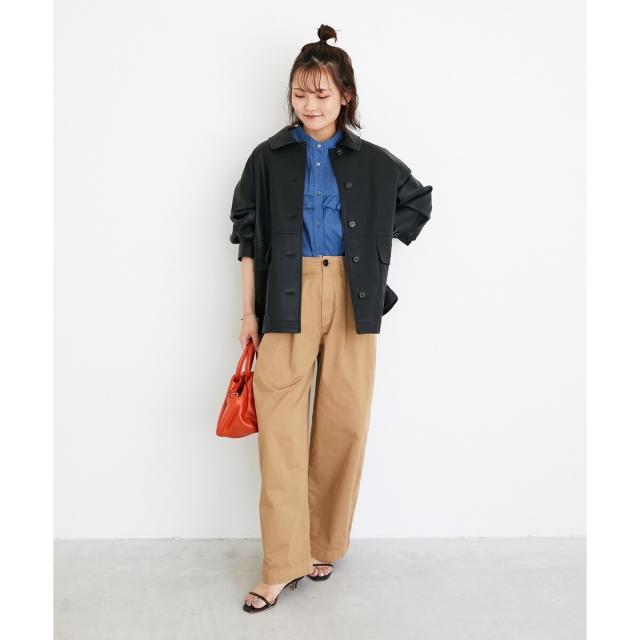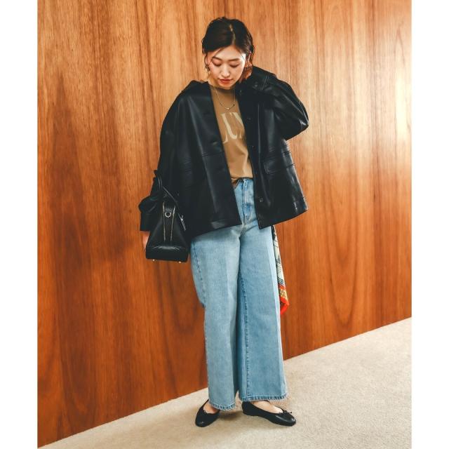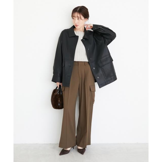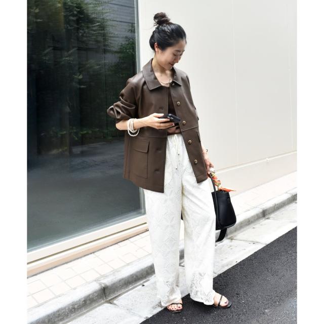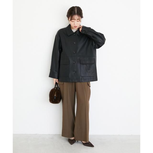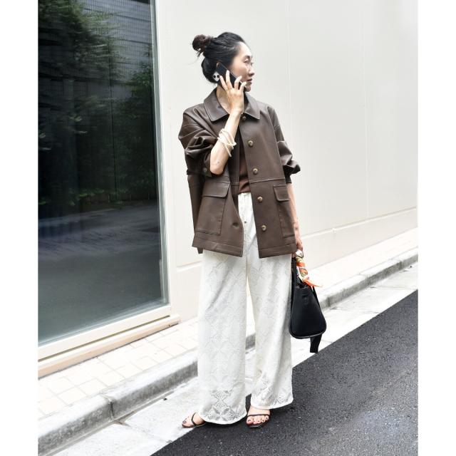 着用感:今年らしいカバーオールジャケットはレザーをチョイス。ブラウンなら辛口すぎずにミックスコーデを楽しめそう◎