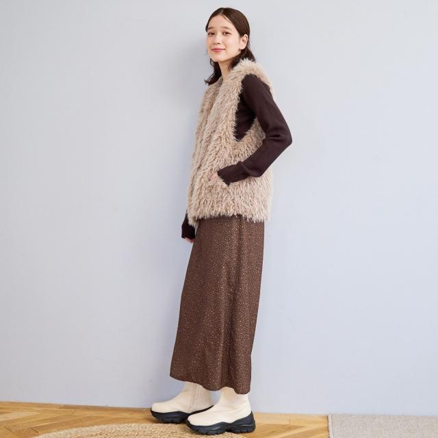 ムートンブーツを合わせると、足元まであたたかい季節感たっぷりのスタイルに。