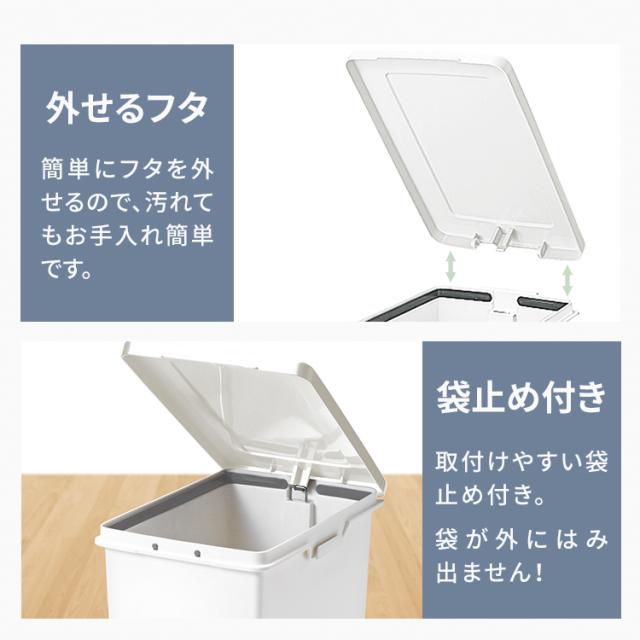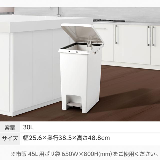 手を使わずに簡単開閉できるペダル式ゴミ箱。場所をとらないスリム設計。容量 : 30リットル サイズ : 幅25.6×奥行38.5×高さ48.8cm材質 : 本体・フタ・ポリ袋止め・ペダル=ポリプロピレン ロッド=スチール(クロームメッキ)日本製
