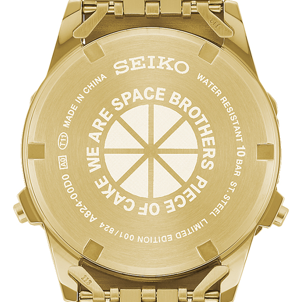 宇宙空間での着用に思いを馳せることのできるナイロンストラップが付属。裏ぶたには、作中で発表されたシンボルマーク“WE ARE SPACE BROTHERS PIECE OF CAKE”が記され、限定モデルの証である「LIMITED EDITION」の文字とシリアルナンバーが配置されています。