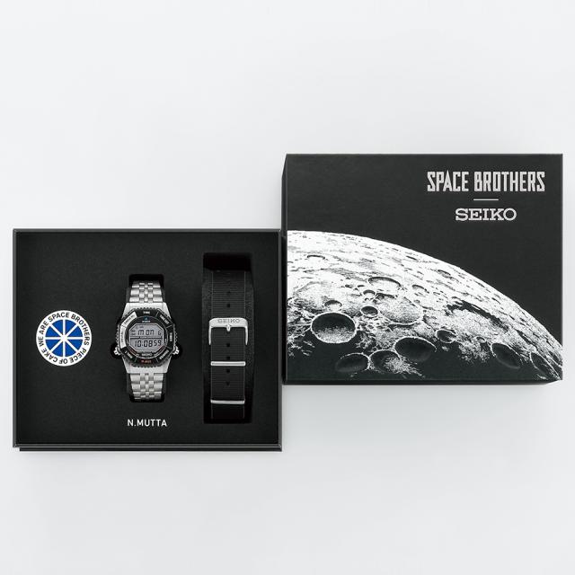 宇宙空間での着用に思いを馳せることのできるナイロンストラップが付属。裏ぶたには、作中で発表されたシンボルマーク“WE ARE SPACE BROTHERS PIECE OF CAKE”が記され、限定モデルの証である「LIMITED EDITION」の文字とシリアルナンバーが配置されています。
