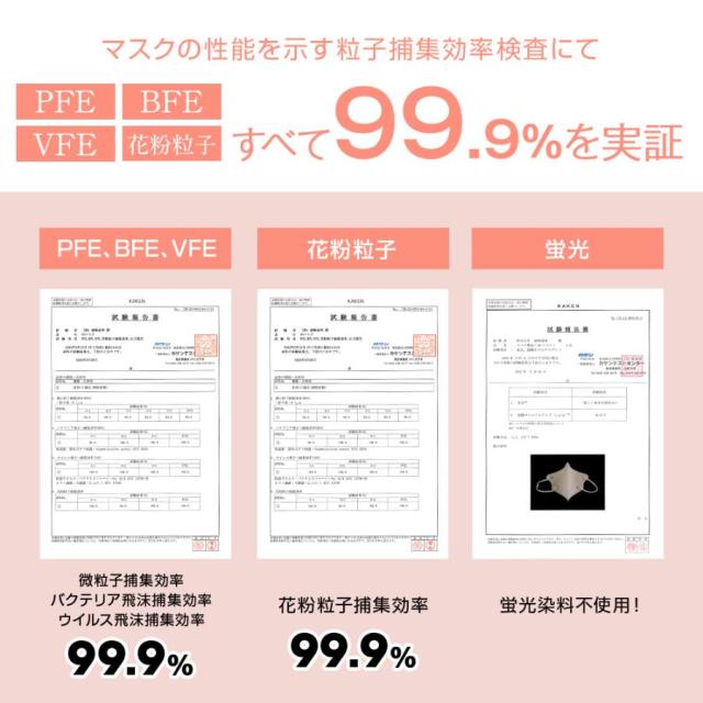 カケンテストセンターによる試験結果: (1)BFE(バクテリア飛沫捕集(ろ過)効率)99.9%カット (2)VFE(ウィルス飛沫捕集(ろ過)効率)99.9%カット