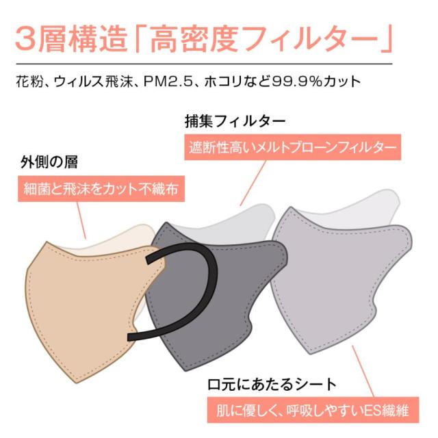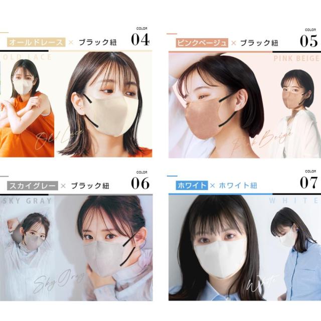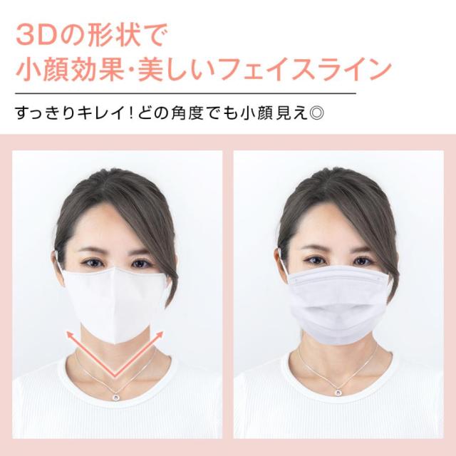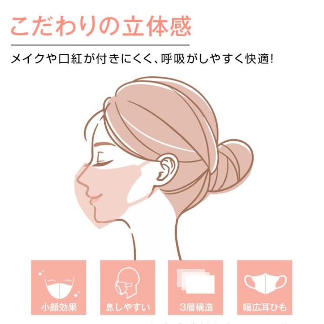 3ピースの立体構造が口元に空間を作ることで、メイクの汚れや口紅の付着を防ぎ、快適な呼吸を実現します。また、小顔効果があり、美しいフェイスラインを実現。