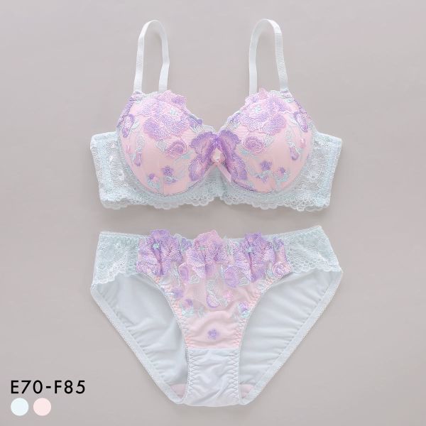 みずみずしいローズ刺繍を色鮮やかに描いた多幸感あふれるブラセット。多色使いのレースに加え、カップとアンダーレースの色をそれぞれ切り替えているので、カラフルで生き生きと華やかなデザインに仕上げています。