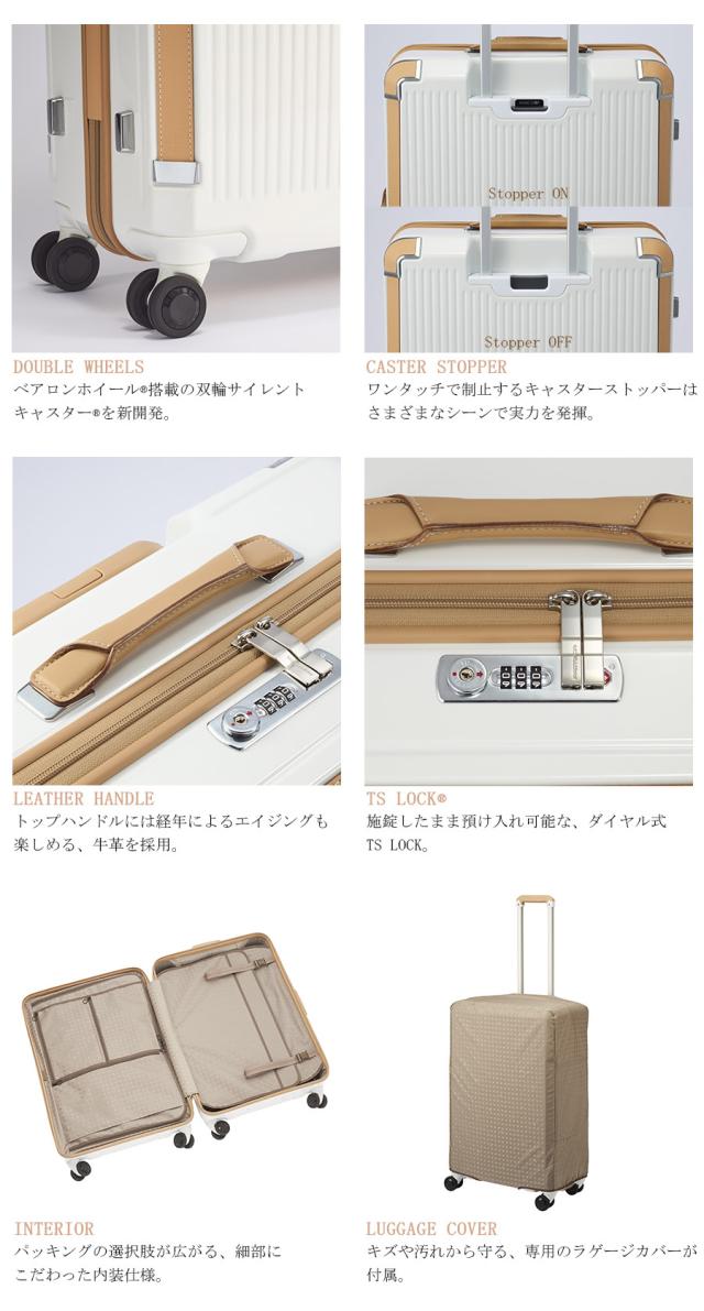 機能一覧:4輪(双輪)/TSダイヤルファスナーロック/サイレントキャスター/ベアロンホイール/MAGIC STOP(キャスターストッパー)