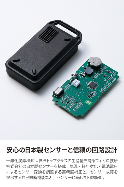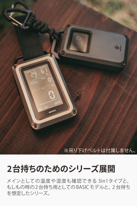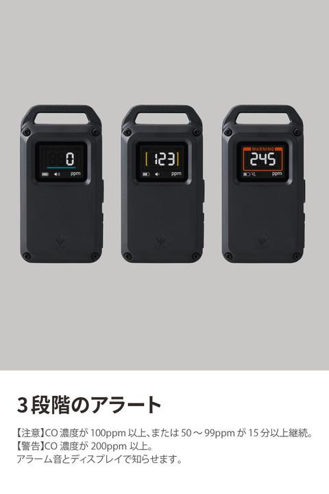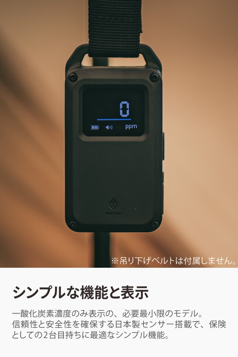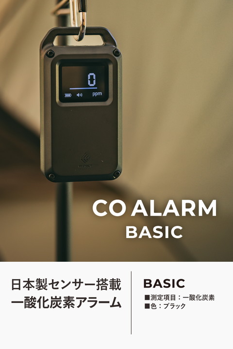 キャンプなどのアウトドアシーンに特化した一酸化炭素アラームです。炭火やストーブ、発電機などから発生する一酸化炭素(CO)を検知し、アラームでお知らせします。テントやタープ、車内での一酸化炭素中毒(CO中毒)を未然に防ぎます。日本製センサーを搭載し、それを最大限に活かす機能を備えた、高い検知精度を実現するベーシックモデルです。