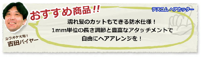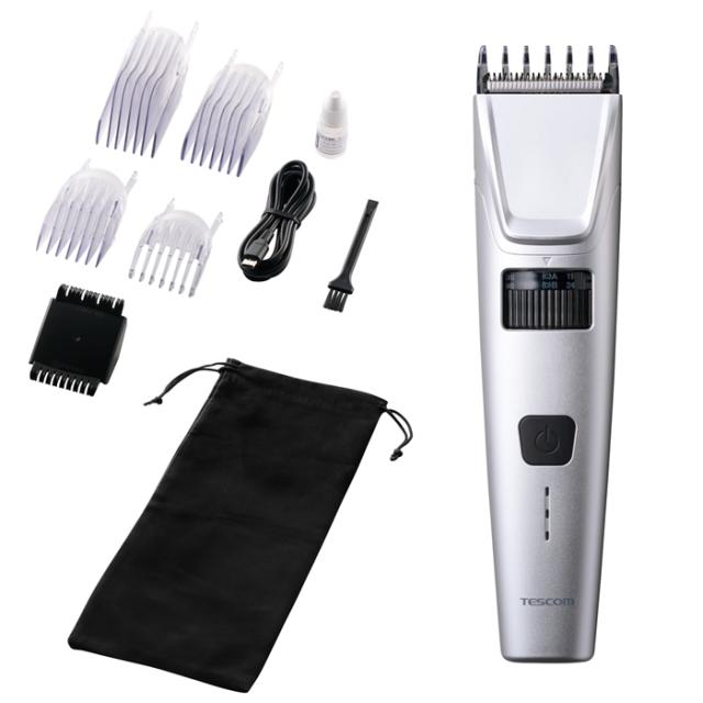 ■付属品:コーム4種(刈り高さ3mm-11mm/16mm-24mm/30mm-38mm/44mm-52mm)、スキ刈りコーム、電源ケーブル(USB Type-C(TM) - USB Type-C)、掃除用ブラシ、TESCOMオイル、収納ポーチ