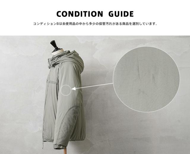 | 商品状態 | 実物新品未使用デッドストック ※コンディションBは未使用品の中から多少の保管汚れがある商品を選別しています。入荷時期によりタグにマジックで線や文字が書いてあるものもございますが、新品未使用品に間違いございません。GEN IIIやプリマロフトのタグがないものも混在しております。商品の状態についてご指定いただくことは出来ませんので予めご了承ください。 | |||||||||||||||||||||