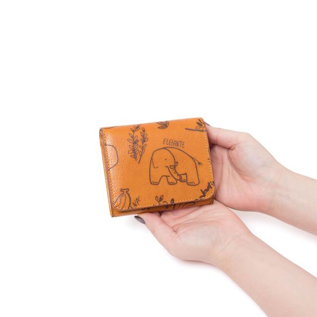 好物を探したり、かくれんぼをしたり、自由気ままに過ごすゾウたちが、手書きタッチのイラストで表現された愛らしいシリーズです。イタリアンレザーの表面をレーザーで焦がす技法を用いて、深みのある風合いに仕上げました。遊び心のある引き手チャームのデザインも魅力の一つです。