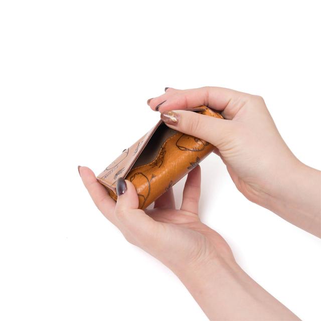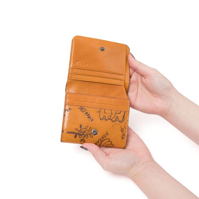 BOX型の小銭入れが付いた二つ折り財布です。カードポケットは合計6つあり、コンパクトですが必要なカードはしっかりと入れることができます。また、カードポケットの裏側についたBOX型小銭入れは、大きく開き、取り出しやすい便利な設計です。
