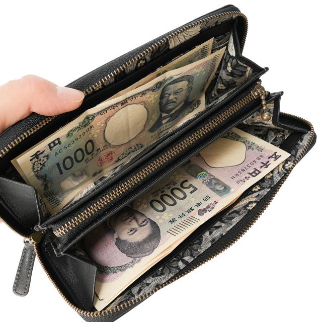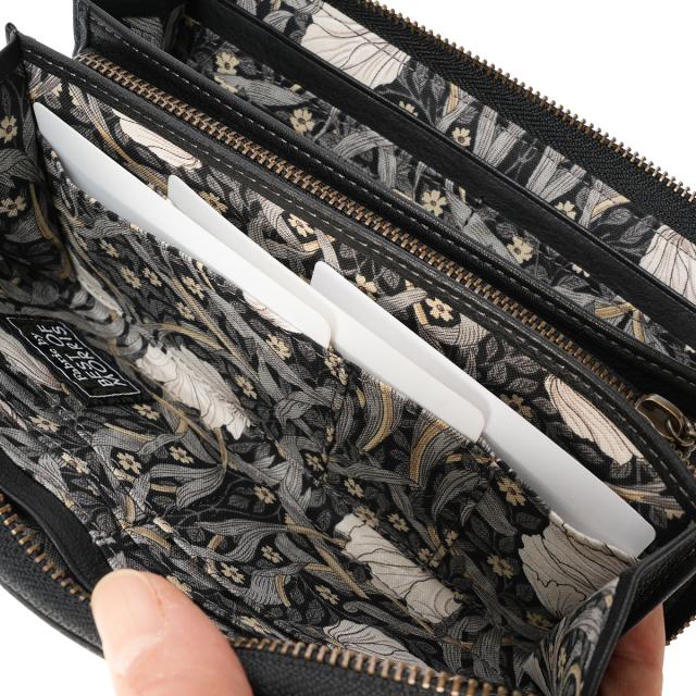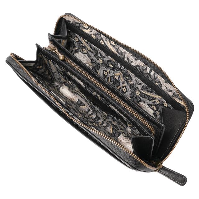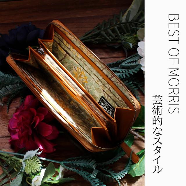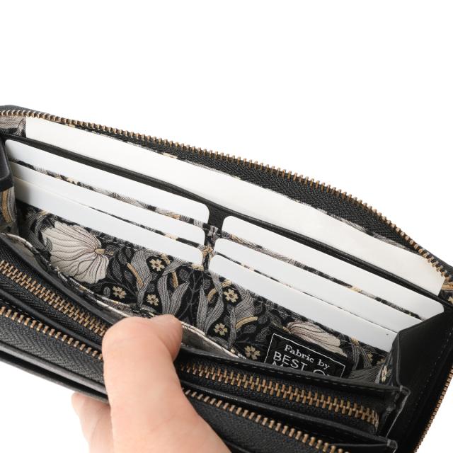 | 「BEST OF MORRIS」の生地を使用した、優しく上品なお財布シリーズ。 軽量で柔らかな牛革を袋縫いでふっくら上品に仕上げました。内装には、時代を超えて愛される「BEST OF MORRIS」の芸術的なテキスタイルを使用。繊細な馬蹄モチーフのブローチと革の美しい表情が、日常のシーンを美しく演出します。 カードが16枚収納できる大容量タイプのお財布です。ファスナーを開けると、内側には「BEST OF MORRIS」の柄生地があしらわれており、上品なデザインを楽しめます。中央には小銭入れ、両側にはお札入れやカードポケットが配置されているため、中身をひと目で見渡せて便利です。 |