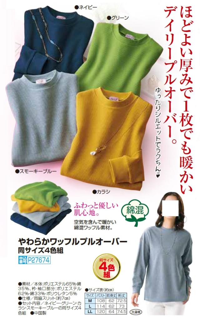 やわらかワッフルプルオーバー 4色組 ニット セーター 綿混 丸首 長袖 クルーネック リブ袖 レディース 婦人服 ミセス シニア 女性 大人 ネイビー グリーン イエロー ブルー 紺色 緑 黄色 薄青 シンプル 40代 50代 60代 70代 80代 母の日 お母さん 秋冬 fri p27674