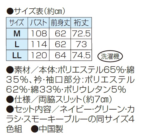 ●素材/本体:ポリエステル65%・綿35%、衿・袖口部分:ポリエステル62%・綿33%・ポリウレタン5%