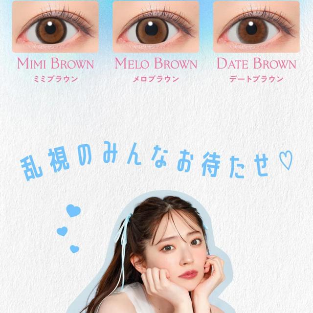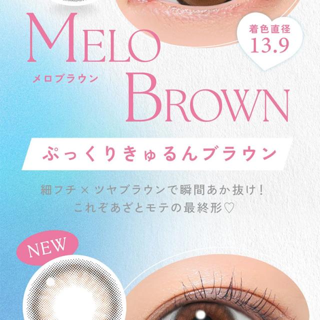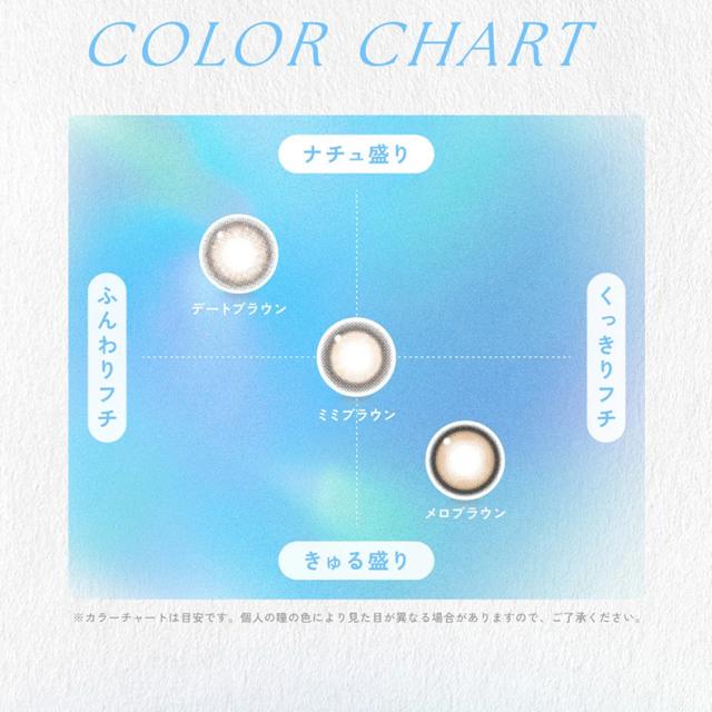 | ◆スペック◆ | 直径(DIA):14.5mm (BC):8.6mm 着色直径:MIMI ROWN 13.7mm DATE BROWN 13.8mm MELO BROWN 13.9mm |