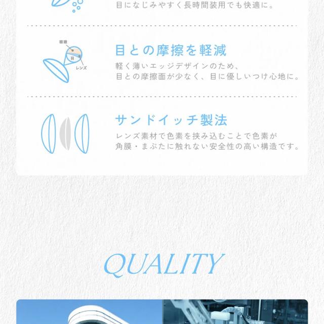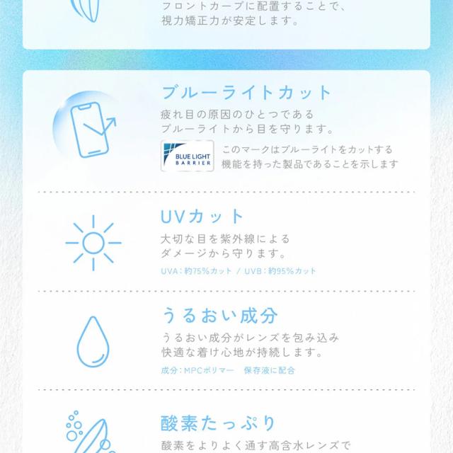 ●コンタクトレンズは目に直接のせて使用するため、少しでも異常を感じた場合はご使用を中止し眼科医へご相談ください。眼のトラブルに関しまして弊社は医療上の責任は一切負いません。ご自身の責任にてご利用ください。