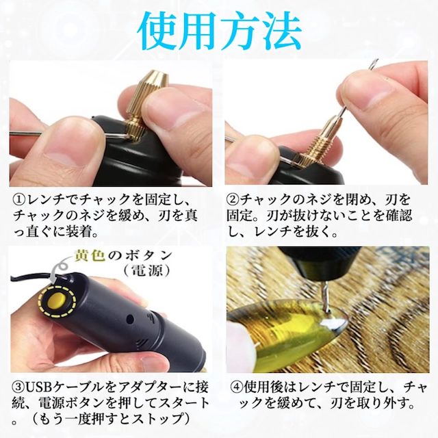 必要なドリルバイトを選択して取り付けた後、電源が接続され、スイッチがオンになっている限り、樹脂金型や工芸、または正確な穴をドリルで穴を開けることができます。さらに、ドリルバイトの取り付けに関する詳細な説明書がパッケージに含まれています。