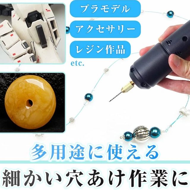 電動ハンドドリルは、樹脂、木材、ポリマークレイ、ジュエリー、真珠、または表面が硬すぎないその他の材料に小さな穴を開けるために使用でき、DIYプロジェクト、ネックレス、イヤリング、ブレスレット、キーチェーン、彫刻を作成するのに非常に役立ちます、人形など。
