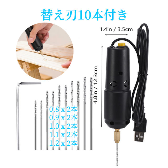 電動ハンドドリルは電力で駆動します。 手動ハンドドリルと比較して、時間を節約し、効率的かつ正確です。ドリルビット10個を選択できます。ドリルビット10個。ジュエリー製作用スクリューアイピン2個 x 0.8mm / 2×1.1mm / 2×1.2mm。ピンバイスリルが趣味や精度の高い作業に最適です。