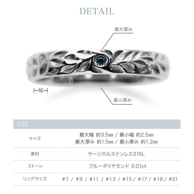 《 商品詳細 》 ●サイズ 7号 / 9号 / 11号 / 13号 / 15号 / 17号 / 19号 / 21号 ●幅 最大:約3.5mm / 最小:約2.5mm ●厚み 最大:約1.5mm / 最小:約1.2mm ●地金/素材 素材: サージカルステンレス316L 石: ブルーダイヤモンド 0.01ct ●刻印 18文字まで可能 ※「.」や「スペース」も1文字扱いになります。 ※お買い物かごの「備考欄」にご記載ください。 ※ペアでご購入のお客様は「男性用」「女性用」それぞれ刻印をご記載ください。 ●付属品 ジュエリーBOX、品質証明カード