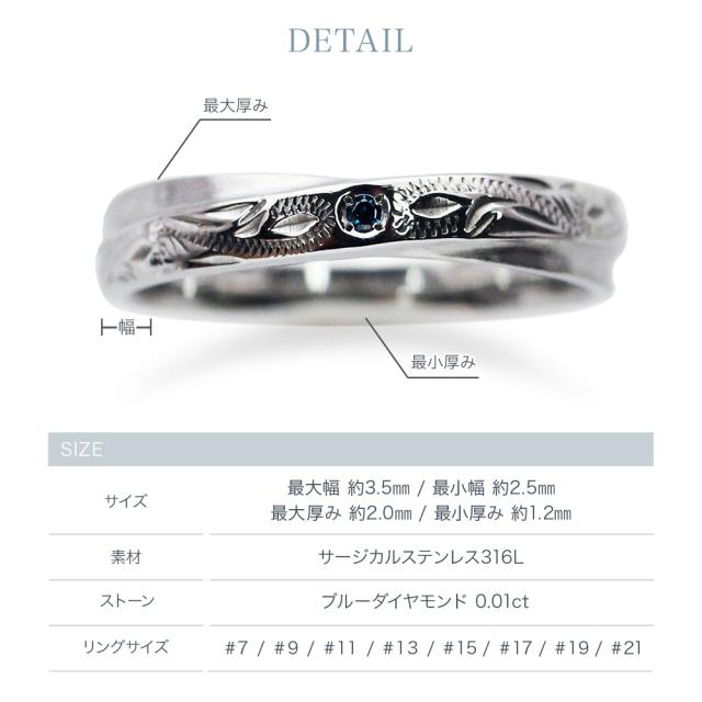 《 商品詳細 》 ●サイズ 7号 / 9号 / 11号 / 13号 / 15号 / 17号 / 19号 / 21号 ●幅 最大:約3.5mm / 最小:約2.5mm ●厚み 最大:約2.0mm / 最小:約1.2mm ●地金/素材 素材: サージカルステンレス316L 石: ブルーダイヤモンド 0.01ct ●刻印 18文字まで可能 ※「.」や「スペース」も1文字扱いになります。 ※お買い物かごの「備考欄」にご記載ください。 ※ペアでご購入のお客様は「男性用」「女性用」それぞれ刻印をご記載ください。 ●付属品 ジュエリーBOX、品質証明カード