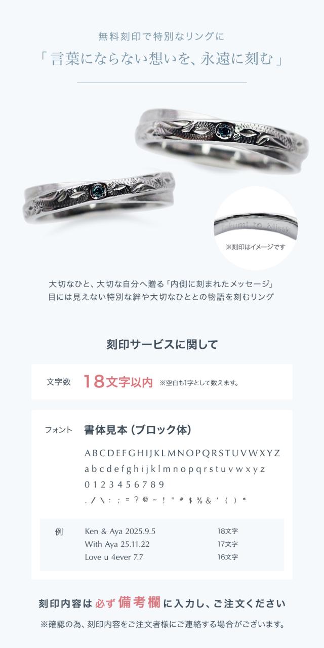 ※ペアでご購入のお客様は「男性用」「女性用」それぞれ刻印をご記載ください。