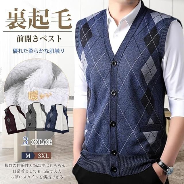 ニットベスト メンズ 裏起毛 前開き ベスト Vネック セーター 厚手 洗える 暖かい 大きいサイズ トップス ノースリーブ 毛玉にできにくい ビジネス カジュアル 紳士 通勤 M-3XL