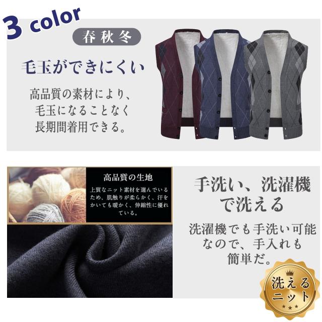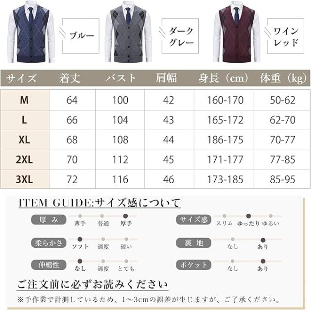【幅広層の方に】ブルー、グレー、ダークレッドと定番の3色を取り揃えたニットベストはどのように合わせてもお気に入りのスタイルが作れます。サイズはMから3XLまで、身長155cmから190cmの方まで対応、会社員、父親など幅広い年齢層の方にに適しており、この細めのVネックベストは普段着としても、クリスマスプレゼント、父の日プレゼントなどにもお勧めです。