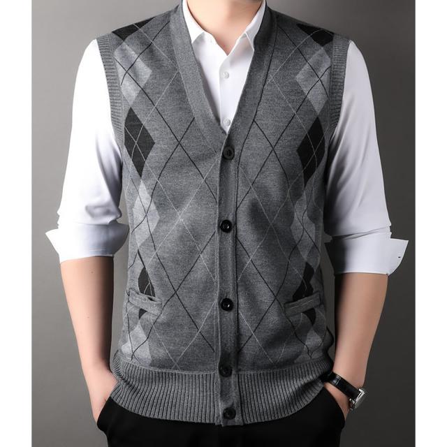 【おしゃれなデザイン】エレガントで大人っぽい雰囲気を演出する優しい肌触りのVネックベスト登場!このカーディガンベストは前開きとボタン留めのデザインで、クラシカルなビジネスニットウエストコートとして、高級感とドライな印象を与え、着脱も簡単です。シンプルなシルエットはシャープでクリーンな印象を与え、大人の紳士らしさを発揮する。