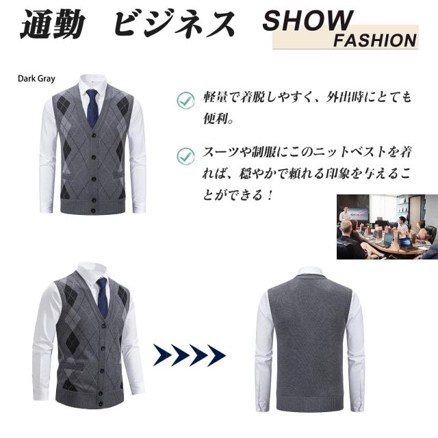 【コーディネートしやすい】エレガントなフィット感とカジュアルなシルエットがこのニットベストを絶妙なものにしている。重ね着がしやすく、通勤、出張、デート、パーティー、旅行、デイリー、宴会、結婚式などのフォーマルなシーンでの着用も万能で、シーズン問わず、ビジネスにもカジュアルにも使える紳士服です。