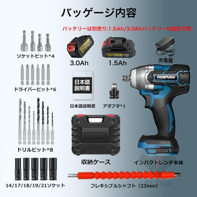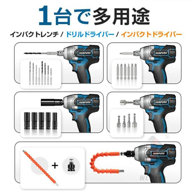 ドライバーアダプターとアクセサリーが付属ため、自動車の修理、タイヤ交換用のインパクトレンチだけではなく、ドリルドライバー とインパクトドライバーとして使えます。ホームメンテナンス、およびナットの締め付けとボルトの緩みに最適です。