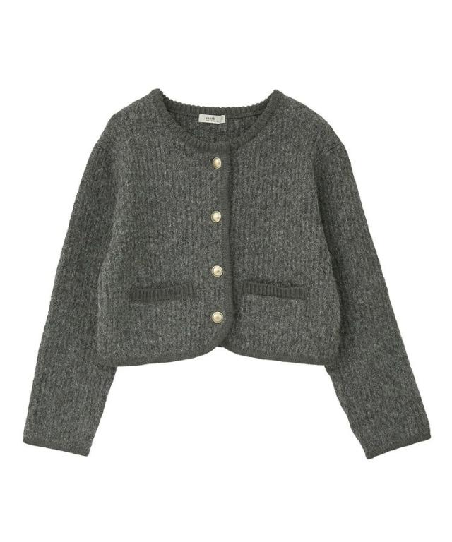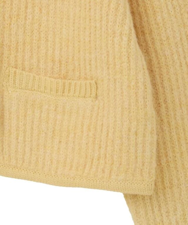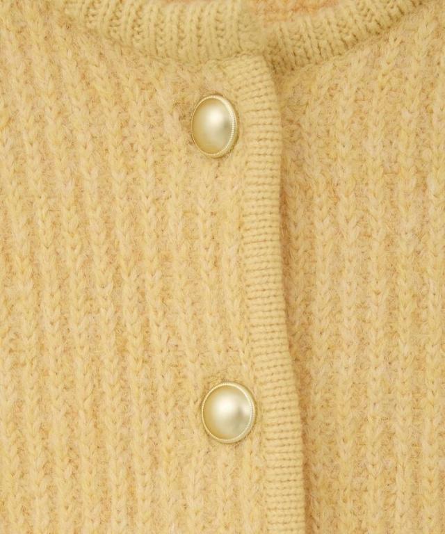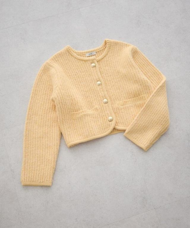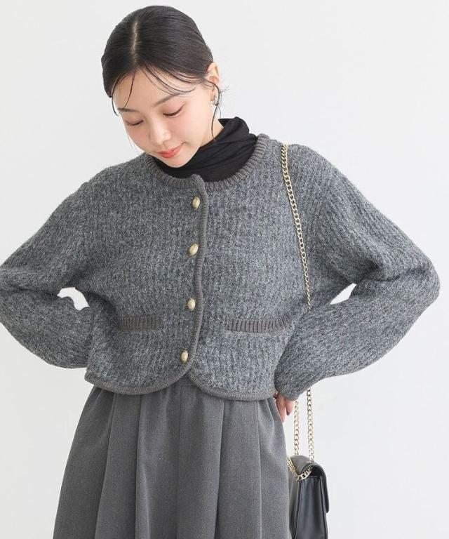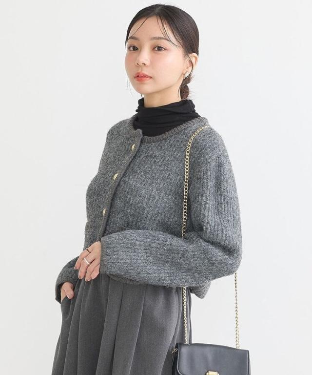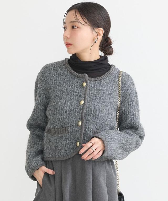 ウール混のメランジ調ニットで仕立てたデザインカーディガン。幅のある袖にコンパクトなフォルムがトレンド感ある1着です。アウトラインを編地でパイピングしたジャケットライクなディテールがこだわりのポイント。マットメタルなゴールドボタンが上品な印象をプラスしてくれます。カジュアルなデニムからボリュームスカートまで幅広く合わせていただけるアイテム。