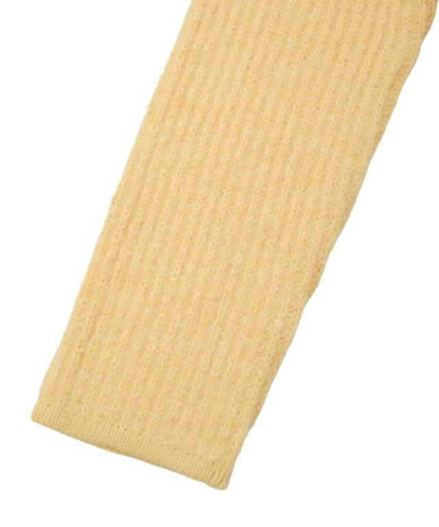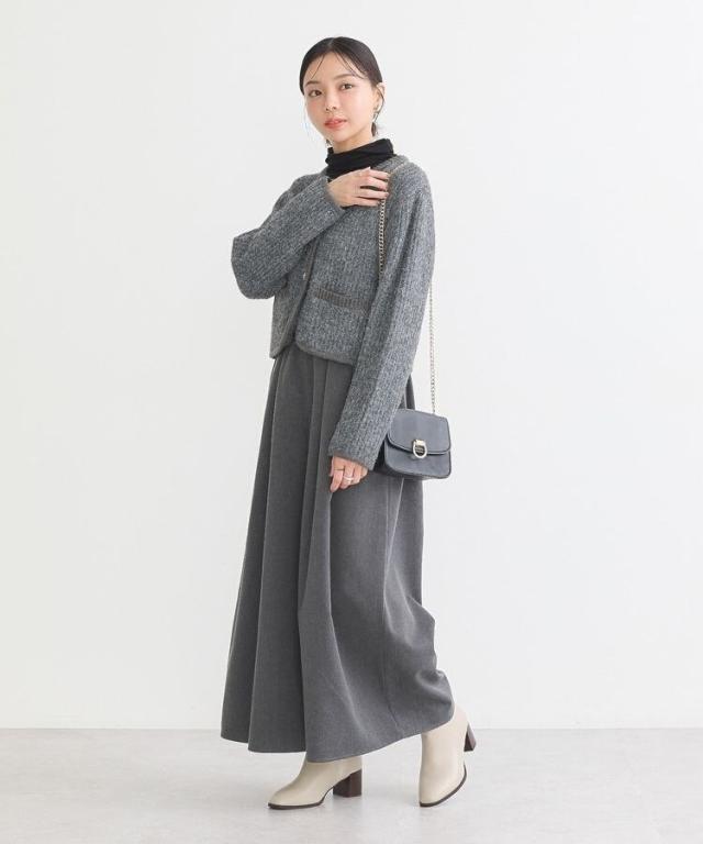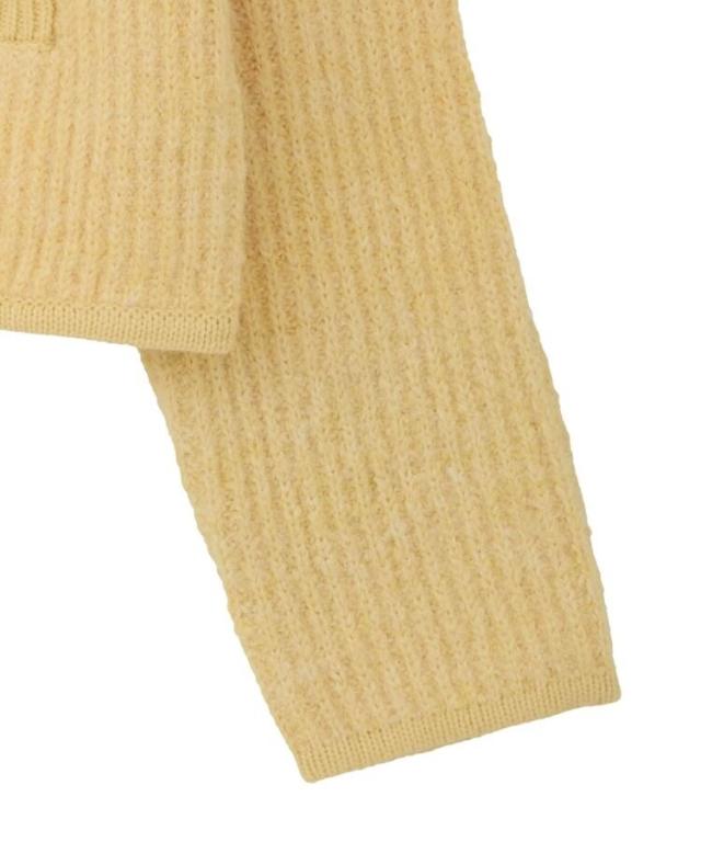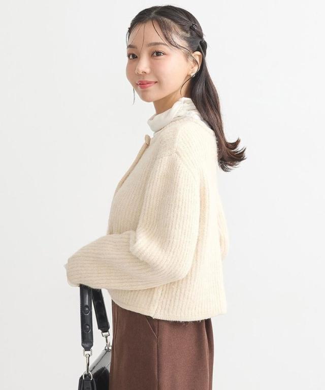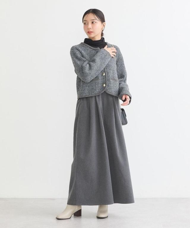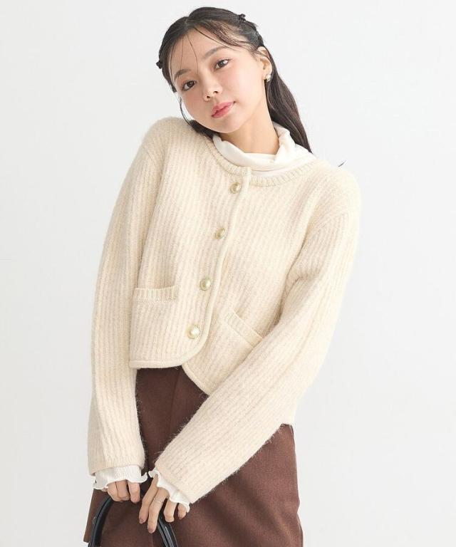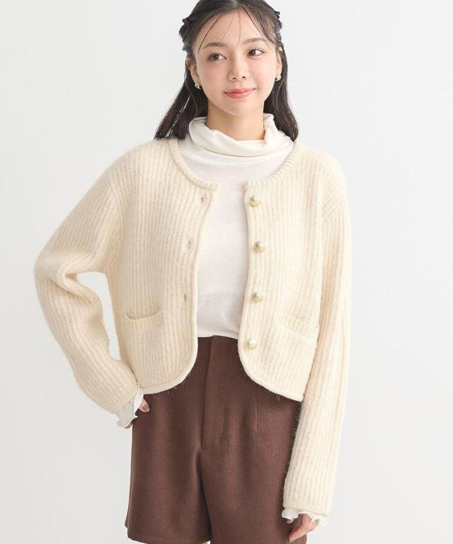 ウール混のメランジ調ニットで仕立てたデザインカーディガン。幅のある袖にコンパクトなフォルムがトレンド感ある1着です。アウトラインを編地でパイピングしたジャケットライクなディテールがこだわりのポイント。マットメタルなゴールドボタンが上品な印象をプラスしてくれます。カジュアルなデニムからボリュームスカートまで幅広く合わせていただけるアイテム。